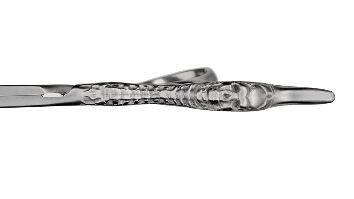 Kraftvolles Design mit stylischem Totenkopf auf dem Fingerauge Matte Oberfläche Weicher Gang und extreme Schärfe Ergonomischer, versetzter Griff gewährleistet entspanntes Schneiden Fester Fingerhaken im Japanischen Stil Japanstahl – Qualität